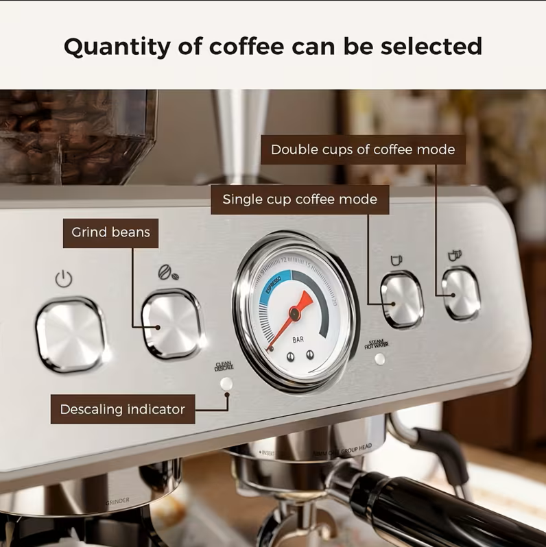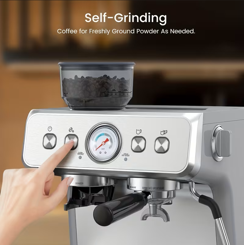 Features: Built-In Grinder, Steam Wand, Hot Water Function, Pressure Gauge
